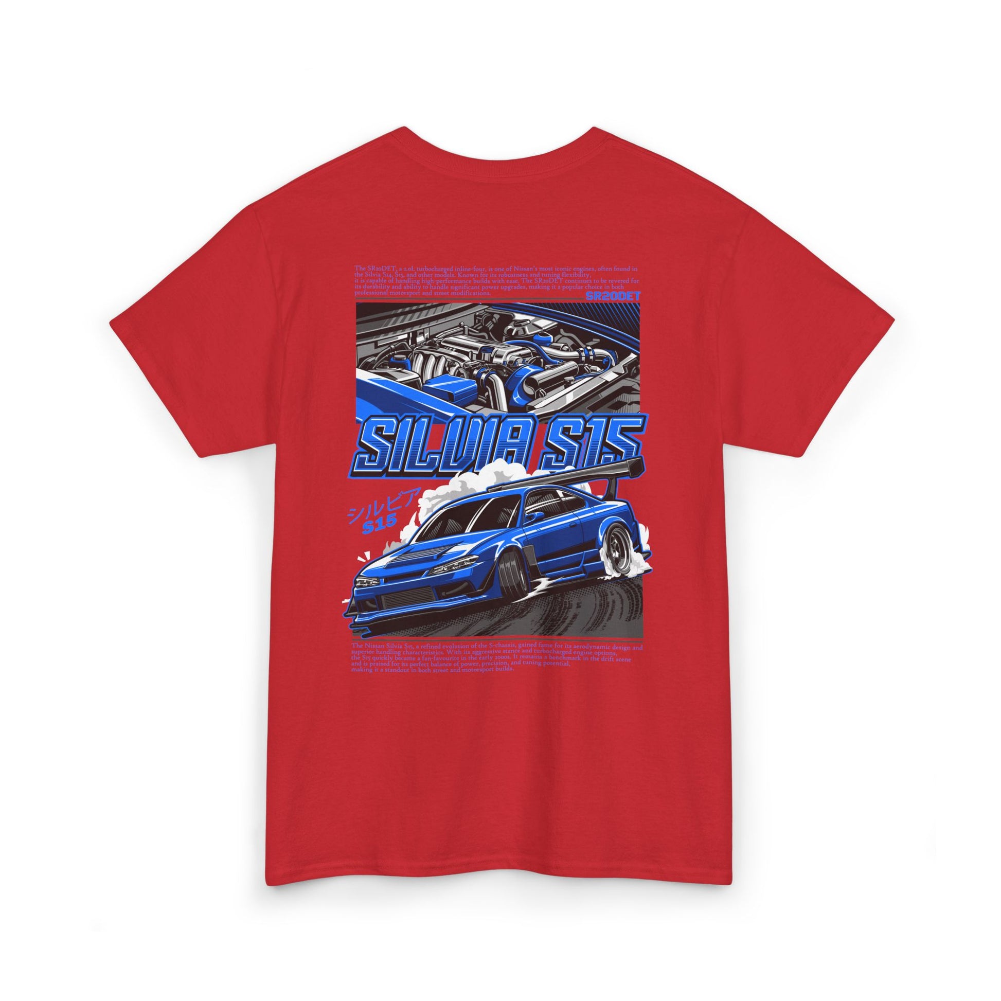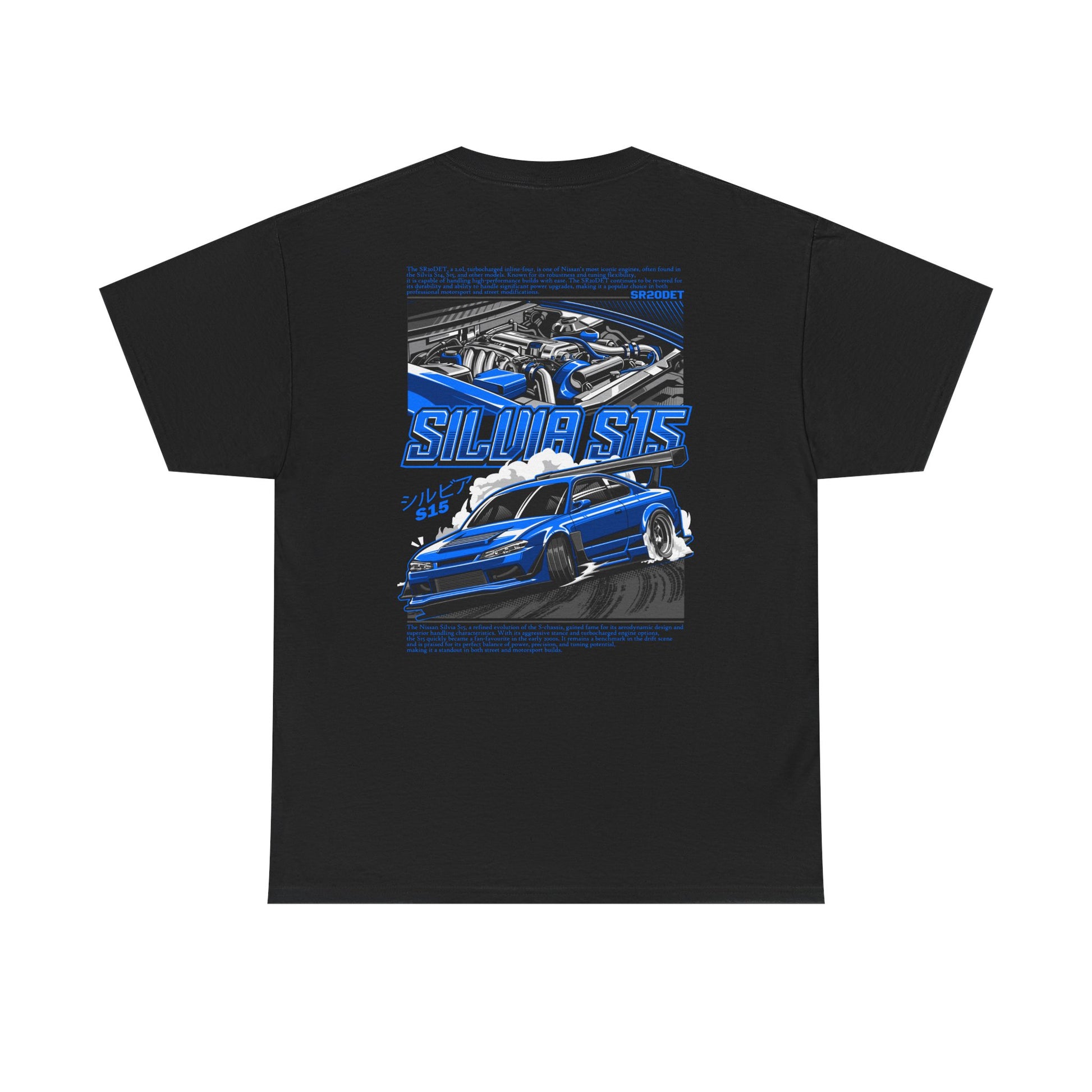 Turn heads with this Silvia S15 SR20DET T-Shirt – Blue Edition, showcasing a widebody S15 drift build paired with a detailed SR20DET turbo engine illustration in vivid blue tones. This bold design captures the aggressive style and performance of Japanese drift culture, making it the perfect choice for car meets, track days, or everyday streetwear.