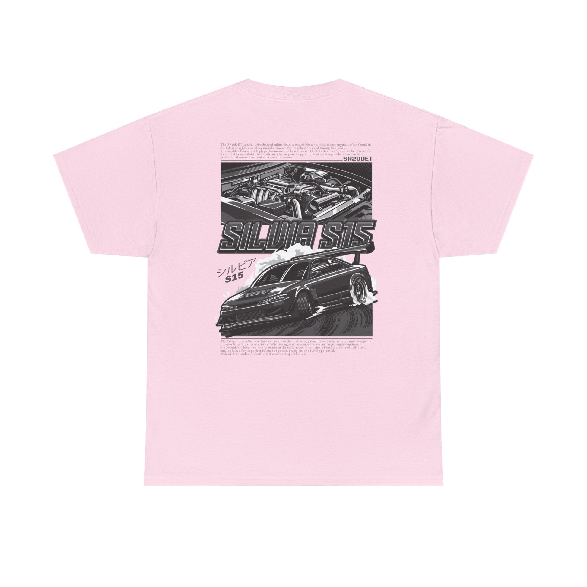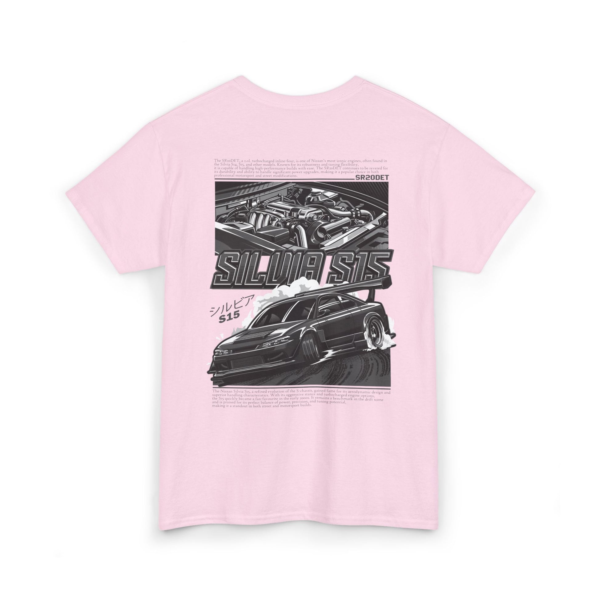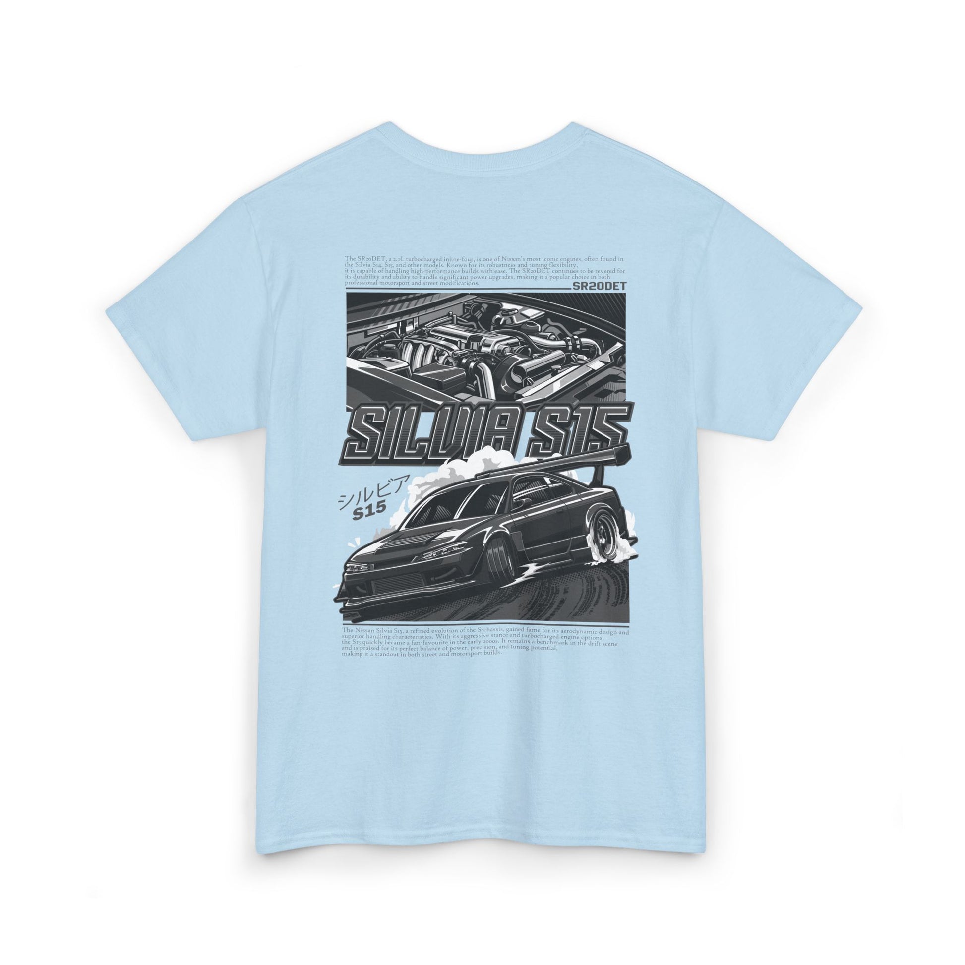 Show your love for a modern S-chassis legend with this Silvia S15 SR20DET T-Shirt – Charcoal Grey Edition, featuring a detailed widebody S15 drift build alongside the iconic SR20DET turbo engine illustration in sleek grey tones. This refined yet bold design captures the style and performance spirit of Japanese drift culture, making it perfect for car meets, track days, or everyday streetwear.