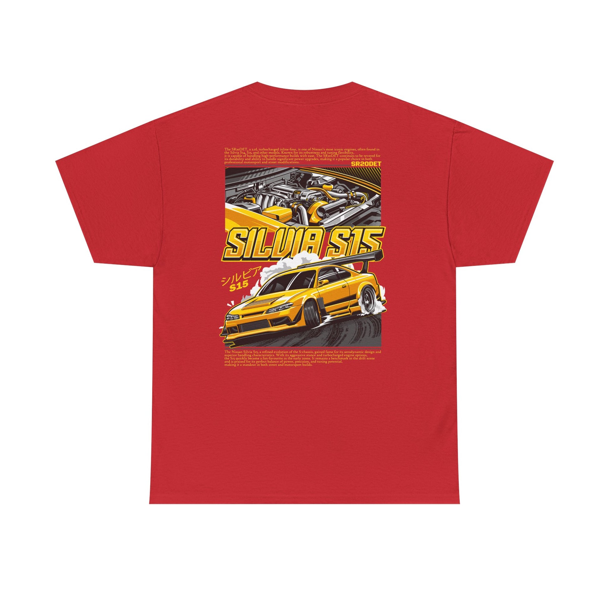 Turn heads with this Silvia S15 SR20DET T-Shirt - Yellow Edition, featuring a widebody S15 drift build alongside a detailed SR20DET turbo engine illustration in bold yellow tones. This vibrant design captures the aggressive style and performance of Japanese drift culture, making it perfect for car meets, motorsport events, or everyday streetwear.